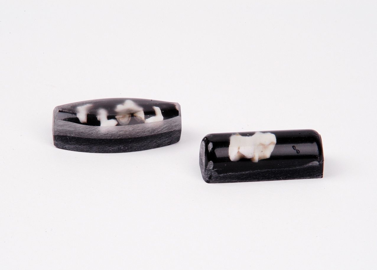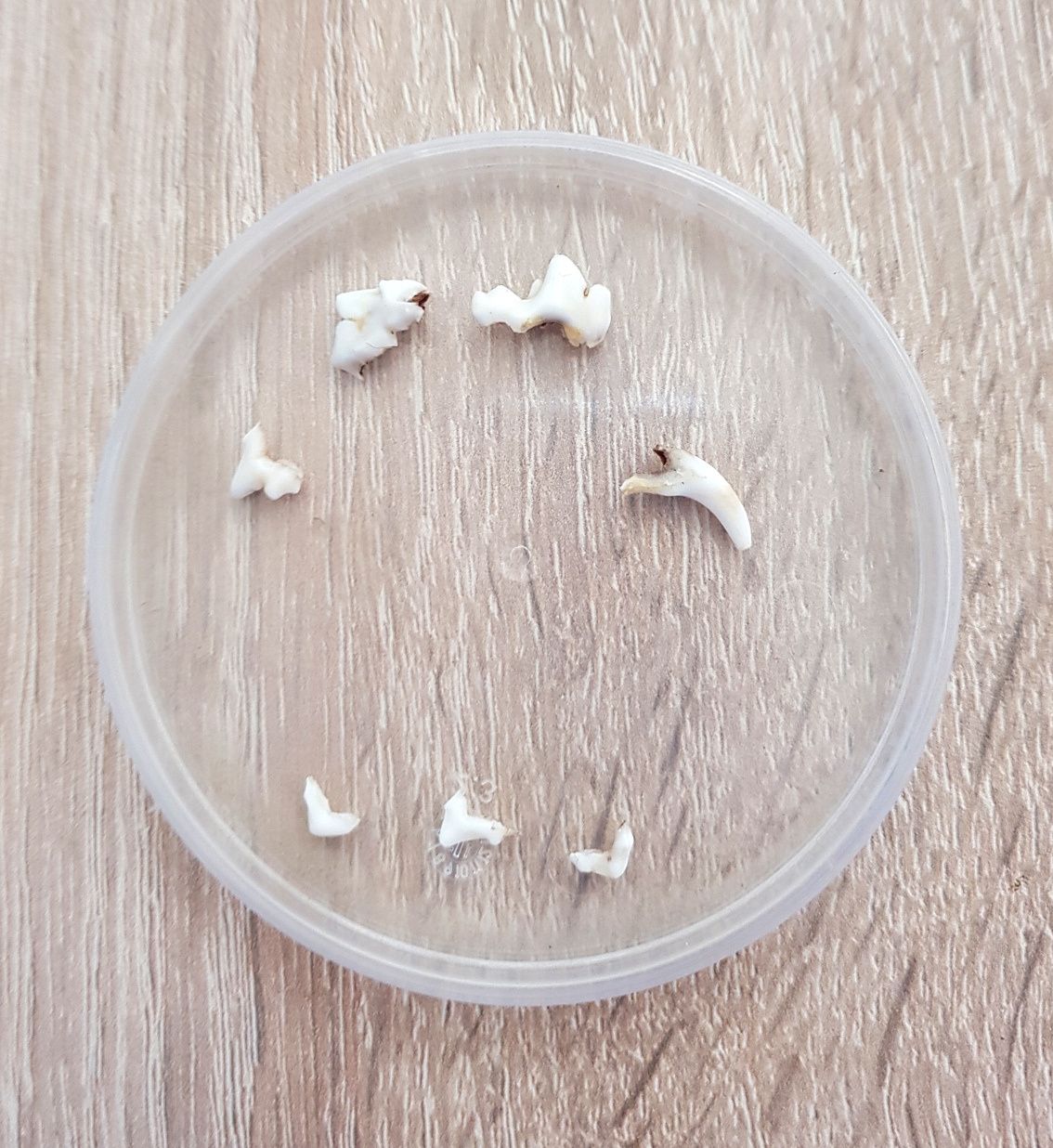 Ausgangspunkt waren die Milchzähne von Lennox. Corinnas Idee war, dass diese zierlichen Zähne als Armband-Schmuckstein und als Anhänger in Kunstharz eingebettet werden.